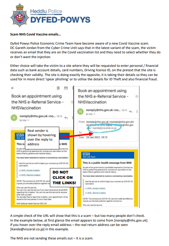 Scam NHS Covid Vaccine Emails 27Jan 2021 Share this: Click to share on X (Opens in new window) X Click to share on Facebook (Opens in new window) Facebook Like Loading... Related