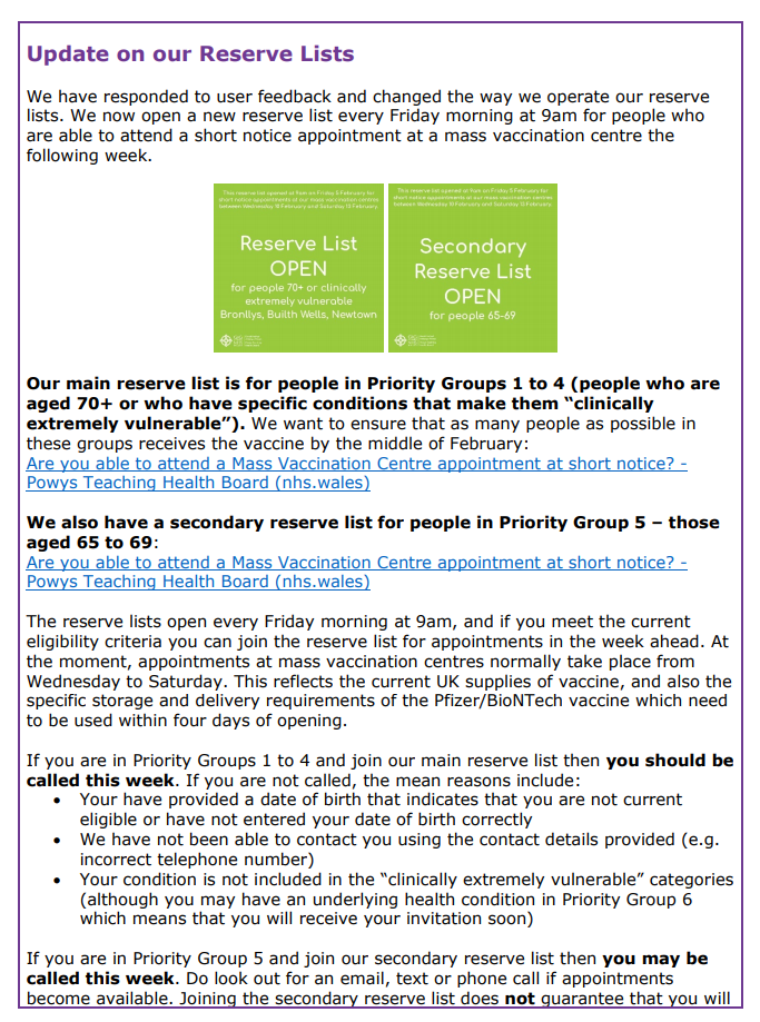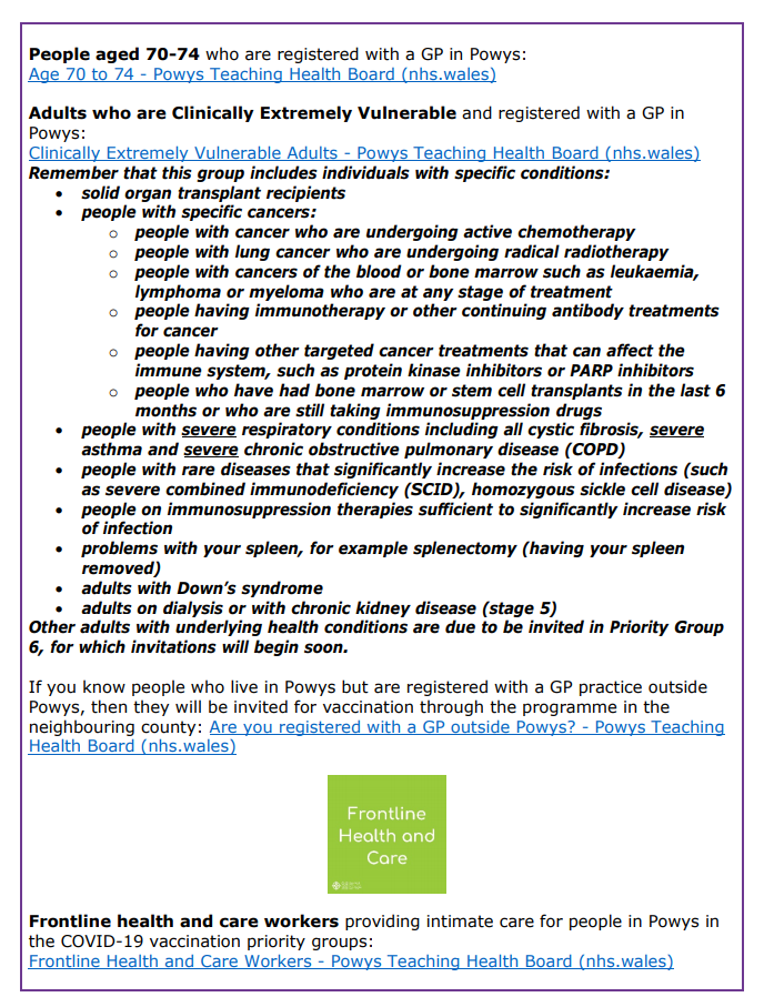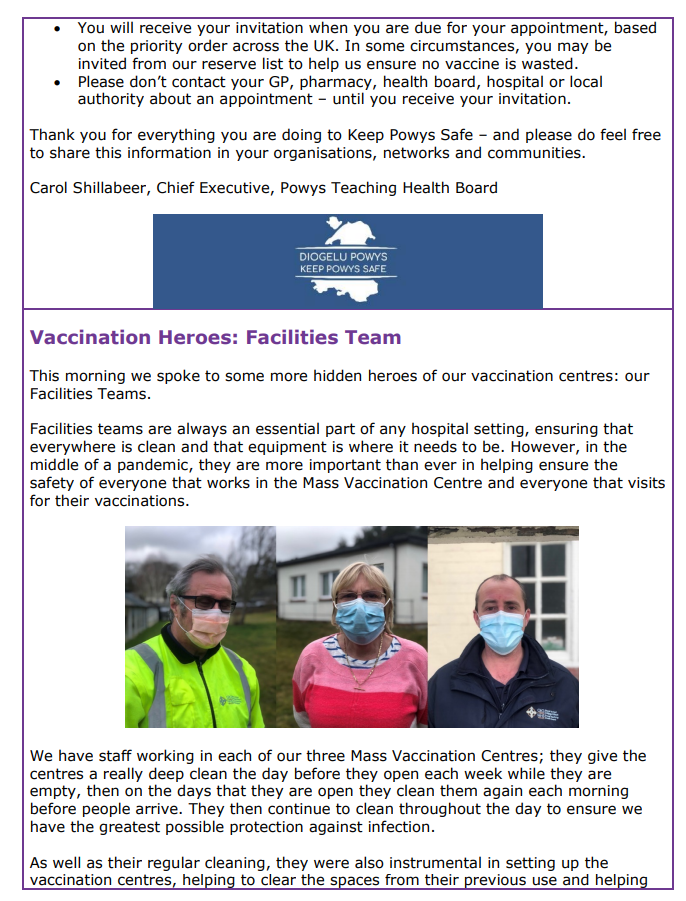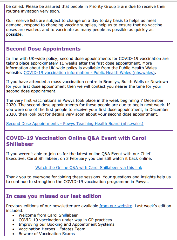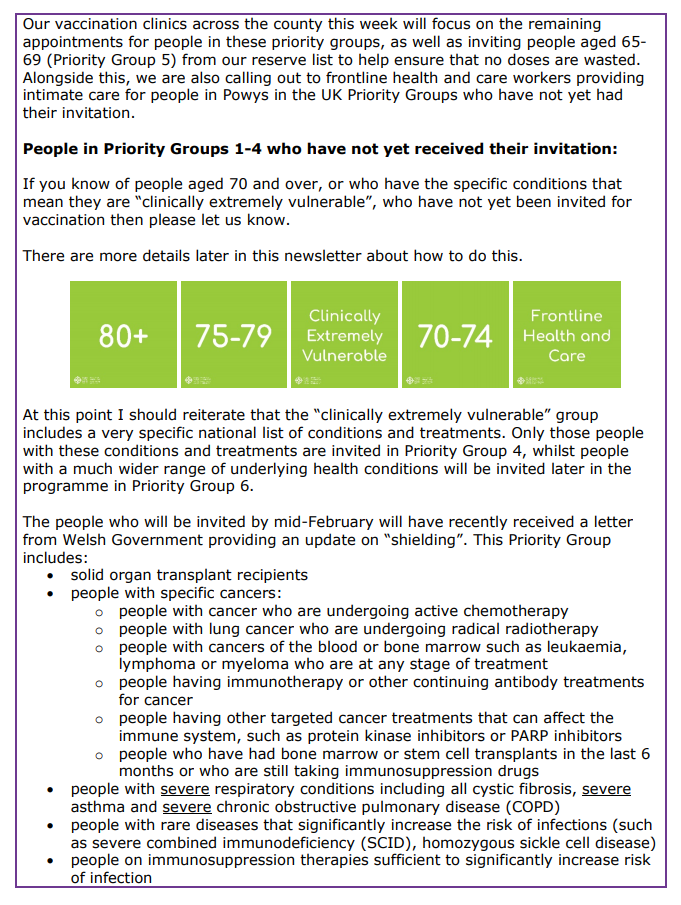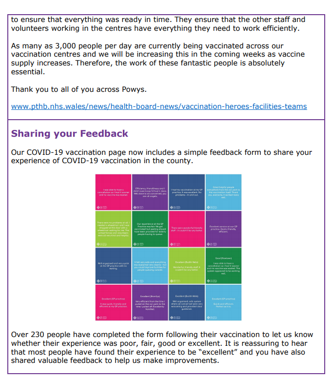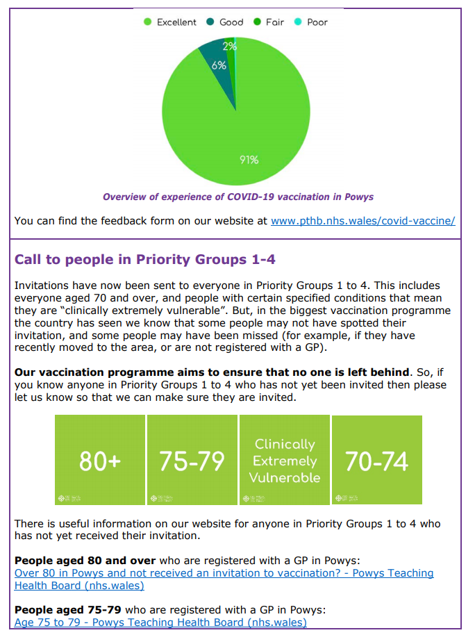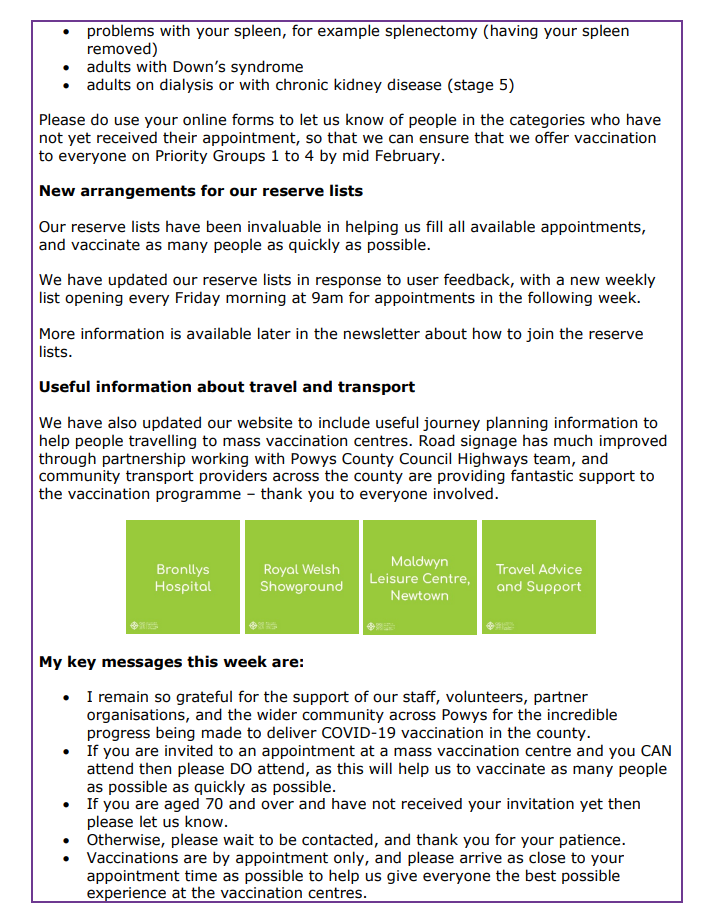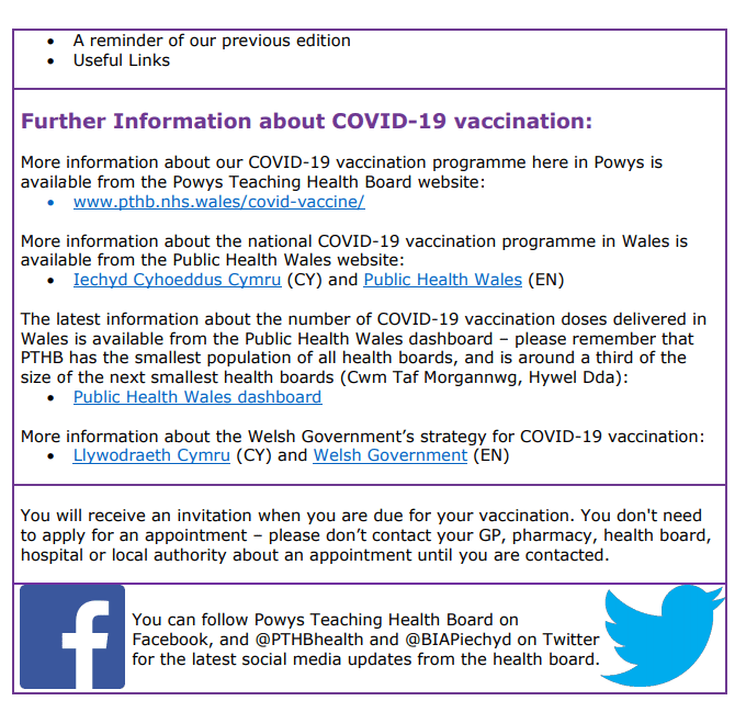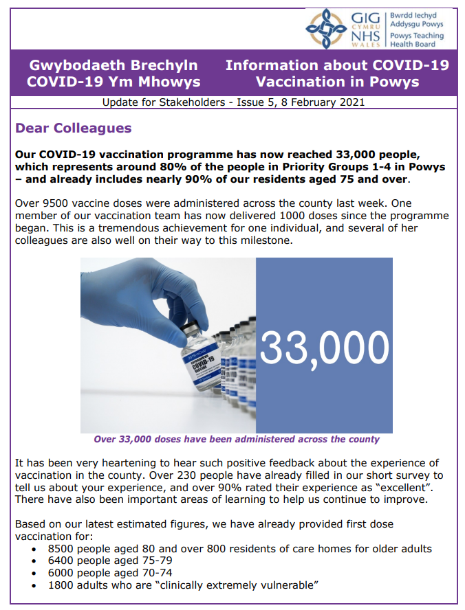 Information about Covid-19 Vaccination in Powys – Issue 5 12Feb 2021 Share this: Click to share on X (Opens in new window) X Click to share on Facebook (Opens in new window) Facebook Like Loading... Related