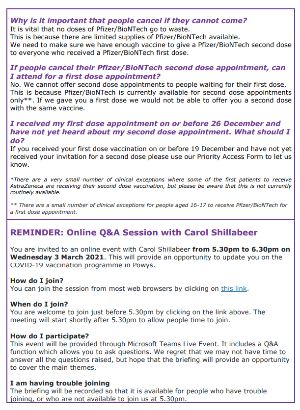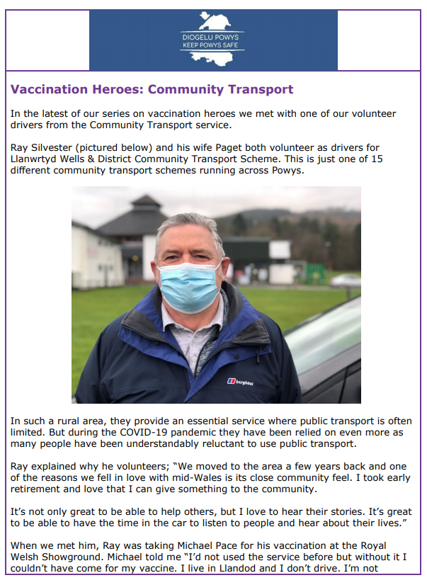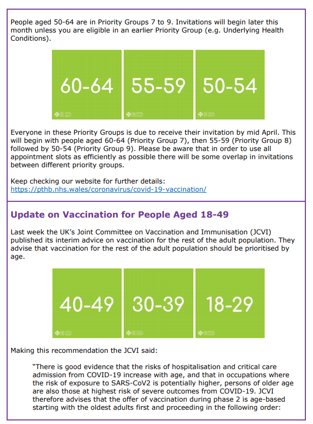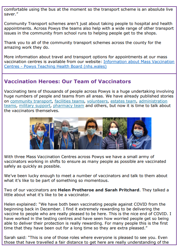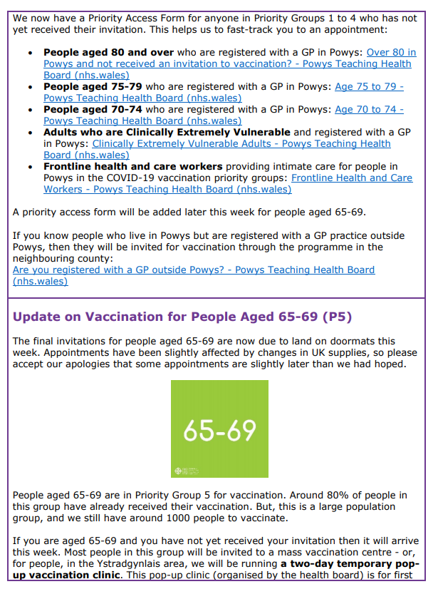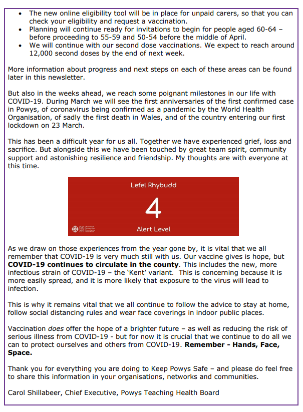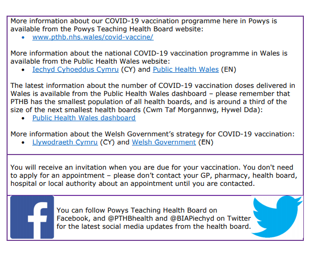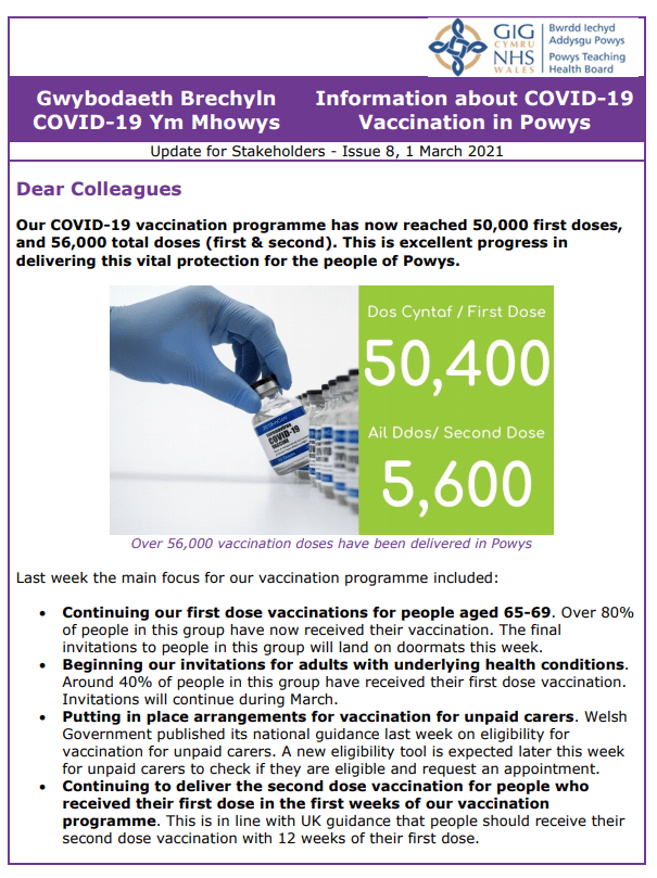 Information about COVID-19 Vaccination in Powys – Issue 8 2Mar 2021 Share this: Click to share on X (Opens in new window) X Click to share on Facebook (Opens in new window) Facebook Like Loading... Related