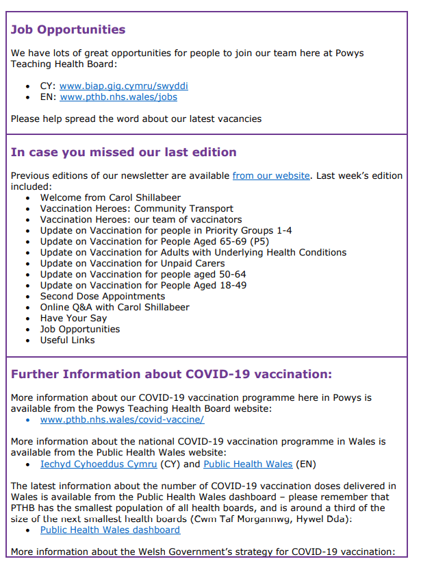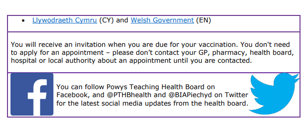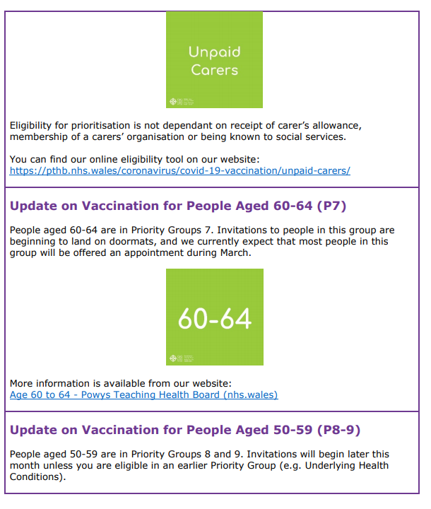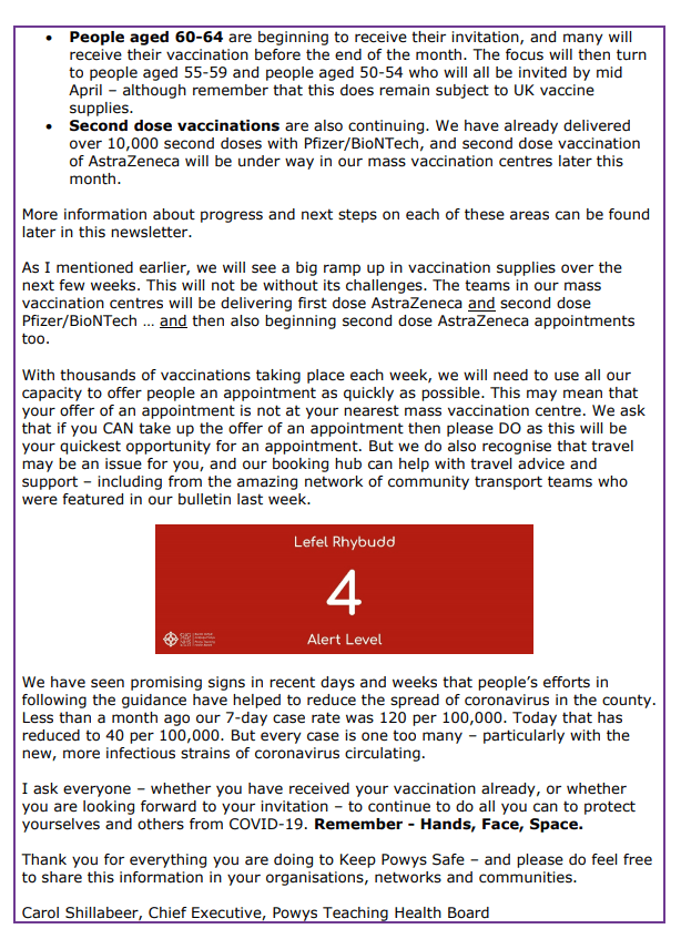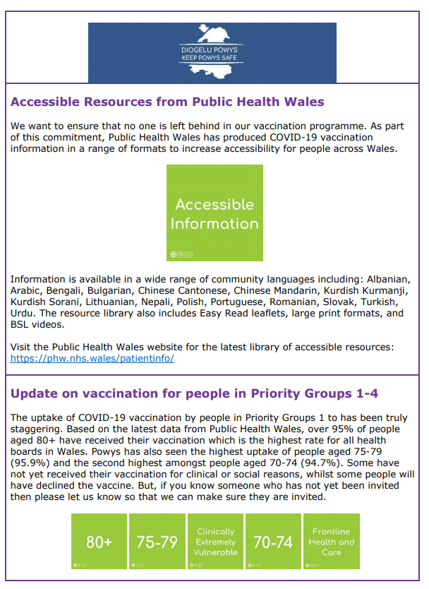 Information about Covid-19 Vaccination in Powys – Issue 9 10Mar 2021 Share this: Click to share on X (Opens in new window) X Click to share on Facebook (Opens in new window) Facebook Like Loading... Related