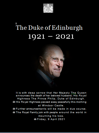 Death of His Royal Highness The Prince Philip, Duke of Edinburgh 9Apr 20219 Apr 2021 Share this: Click to share on X (Opens in new window) X Click to share on Facebook (Opens in new window) Facebook Like Loading... Related