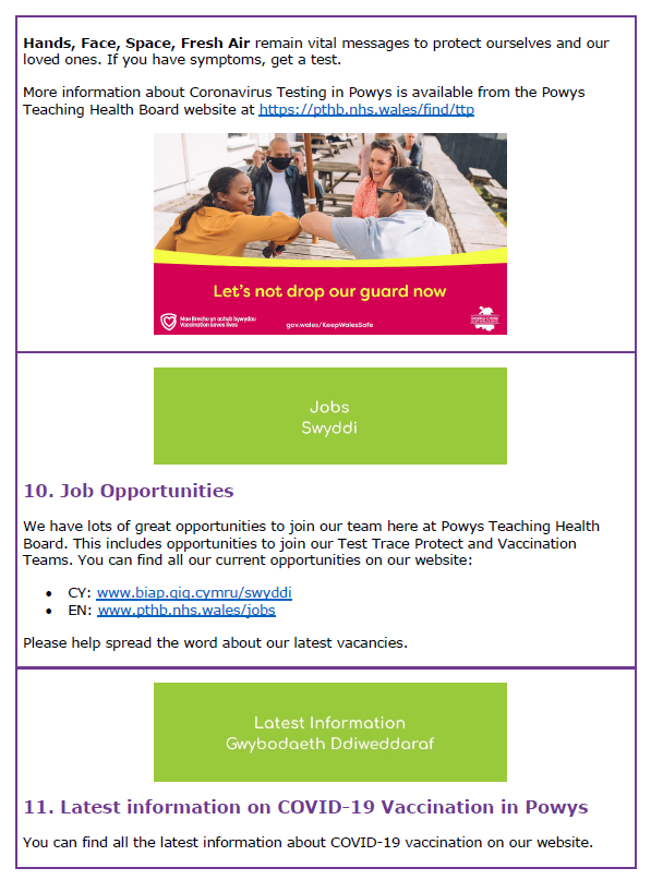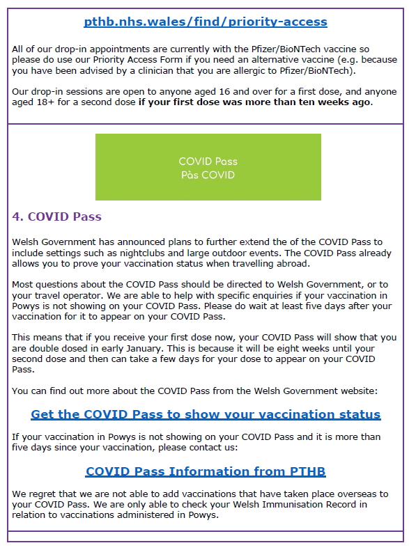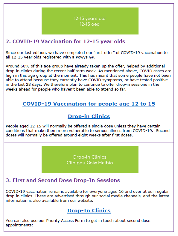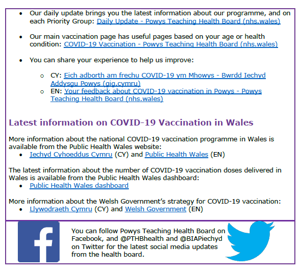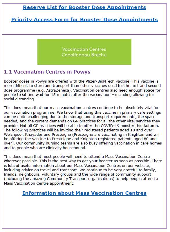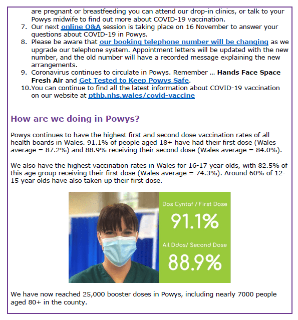 Information about COVID-19 Vaccination in Powys – 1st November 2021 31Oct 202131 Oct 2021 Share this: Click to share on X (Opens in new window) X Click to share on Facebook (Opens in new window) Facebook Like Loading... Related