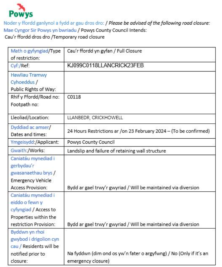 Road Closure due to Landslip (Llanbedr to Fforest Coal Pit) 24Feb 202424 Feb 2024 Share this: Click to share on X (Opens in new window) X Click to share on Facebook (Opens in new window) Facebook Like Loading... Related