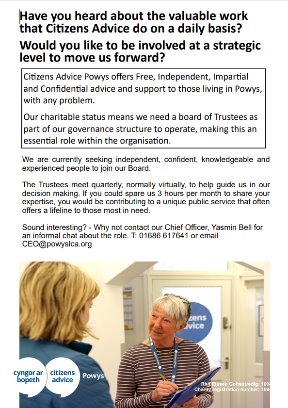 Citizens Advice Powys – Trustee recruitment 30Jul 2024 Share this: Click to share on X (Opens in new window) X Click to share on Facebook (Opens in new window) Facebook Like Loading... Related