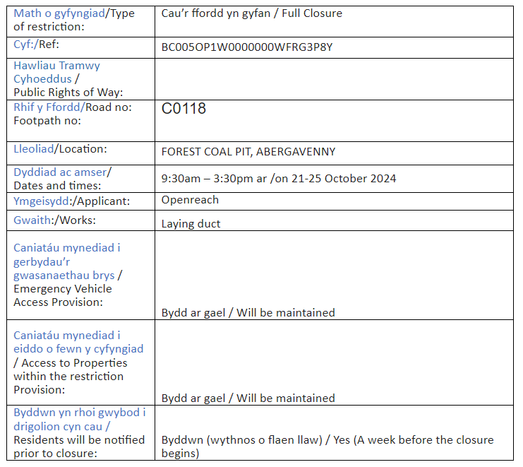 PUBLIC NOTICE: Temporary Road Closure: C0118 FOREST COAL PIT, ABERGAVENNY (21-25 Oct 2024) 30Sep 2024 Share this: Click to share on X (Opens in new window) X Click to share on Facebook (Opens in new window) Facebook Like Loading... Related