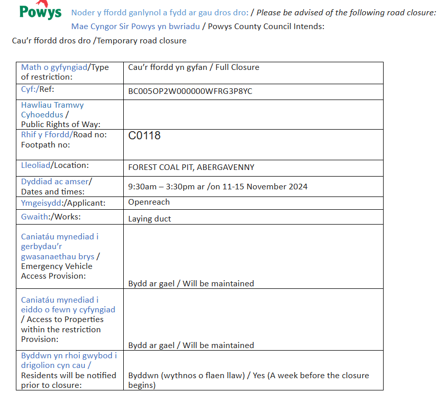 Temporary Road Closure: C0118 FOREST COAL PIT, ABERGAVENNY (11-15 Nov 2024) 7Oct 2024 Share this: Click to share on X (Opens in new window) X Click to share on Facebook (Opens in new window) Facebook Like Loading... Related