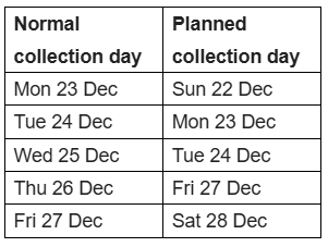Collections days for the first half of Christmas week (until Wednesday 25 December) will be one day earlier than normal. Collections for the second half of the week (from Thursday 26 December) will be one day later than normal, with crews working on both Sunday 22 December and Saturday 28 December.