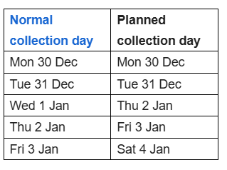 There will be no change to collections of the first two days of New Year week, with collections one day later than normal from 1 January, with crews working on Saturday 4 January.