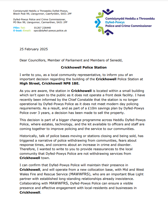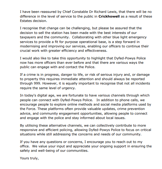 Letter from Police & Crime Commissioner regarding closure of Crickhowell Police Station 27Feb 2025 Share this: Share on X (Opens in new window) X Share on Facebook (Opens in new window) Facebook Like Loading... Related