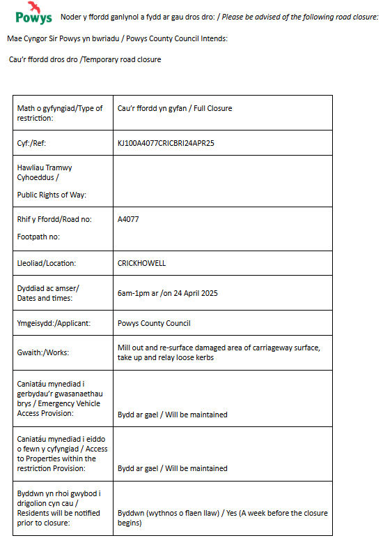 Temporary Road Closure: A4077 CRICKHOWELL BRIDGE (24 Apr 2025) 20Apr 2025 Share this: Click to share on X (Opens in new window) X Click to share on Facebook (Opens in new window) Facebook Like Loading... Related