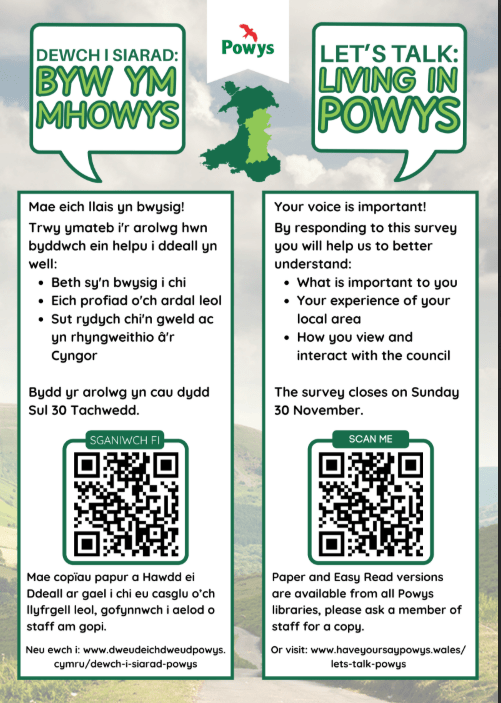 For more info and to access downloadable print and Easy Read copies, visit: https://www.haveyoursaypowys.wales/lets-talk-powys or pop into your local library.