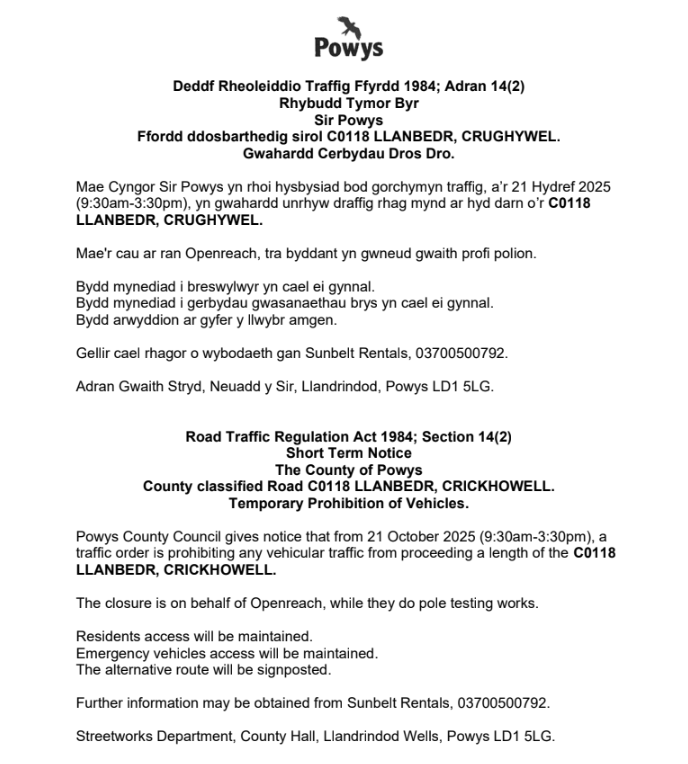 Temporary Road Closure: C0118 LLANBEDR, CRICKHOWELL (21 Oct 2025) 15Oct 2025 Share this: Click to share on X (Opens in new window) X Click to share on Facebook (Opens in new window) Facebook Like Loading... Related